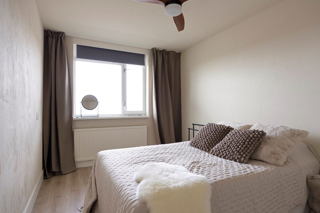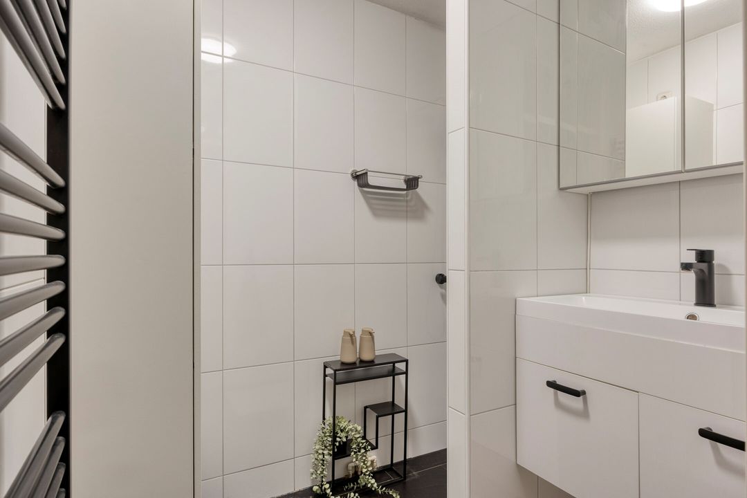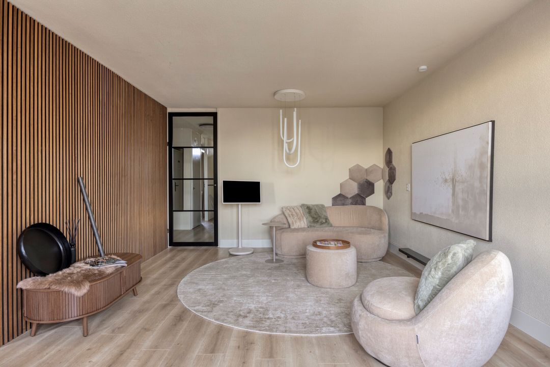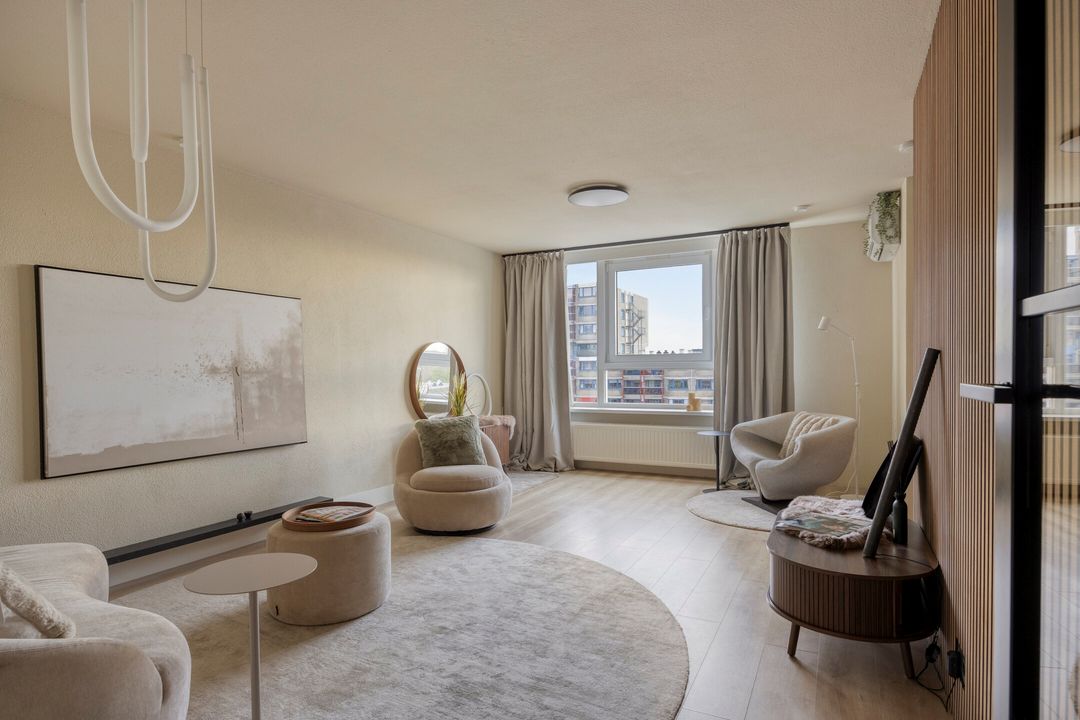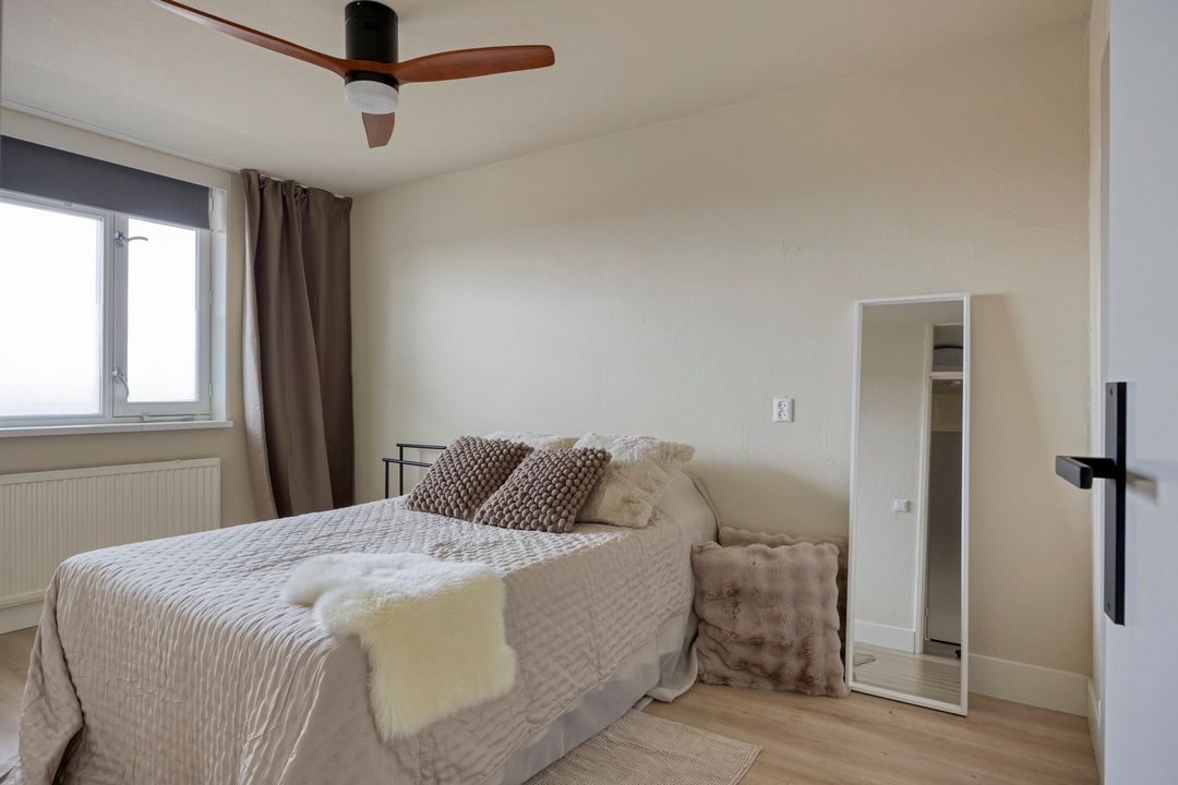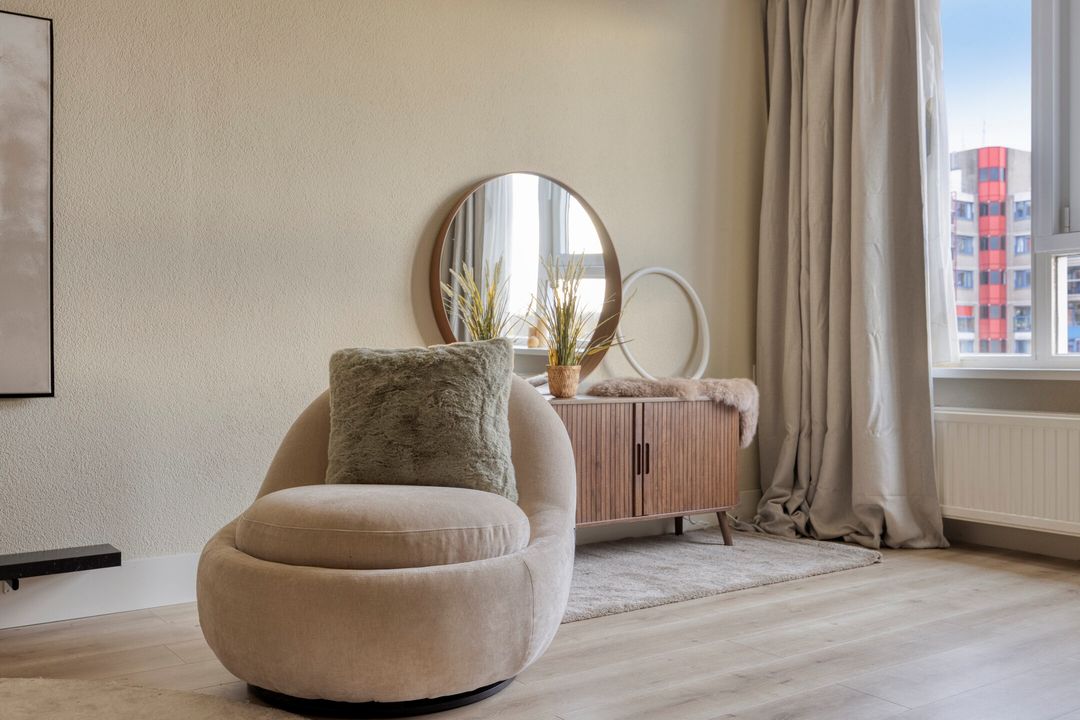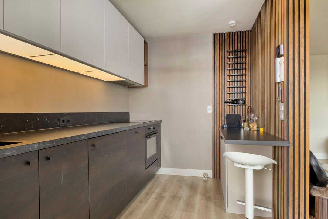 Appartement (8e verdieping): entree, hal, toegang tot een provisiekast, een meterkast (schakelkast met automaten) en cv-/wasruimte, het moderne toilet met fontein, ruime (ouder)slaapkamer met inloopkast en een 2de slaapkamer welke momenteel in gebruik is als werkkamer. Een moderne tot plafondhoogte betegelde badkamer met inloopdouche, handdoekradiator en badkamermeubel. Ruime woonkamer met doorloop naar de halfopen keuken in parallel-opstelling, voorzien van HPL werkbladen en inbouwapparatuur (o.a. koelkast, vaatwasser, geïntegreerde rvs afzuigkap, inductie kookplaat, combi-oven). Grenzend aan de keuken vindt u de toegang tot het balkon, welke volledig is afgewerkt met hardhouten vlonderdelen.