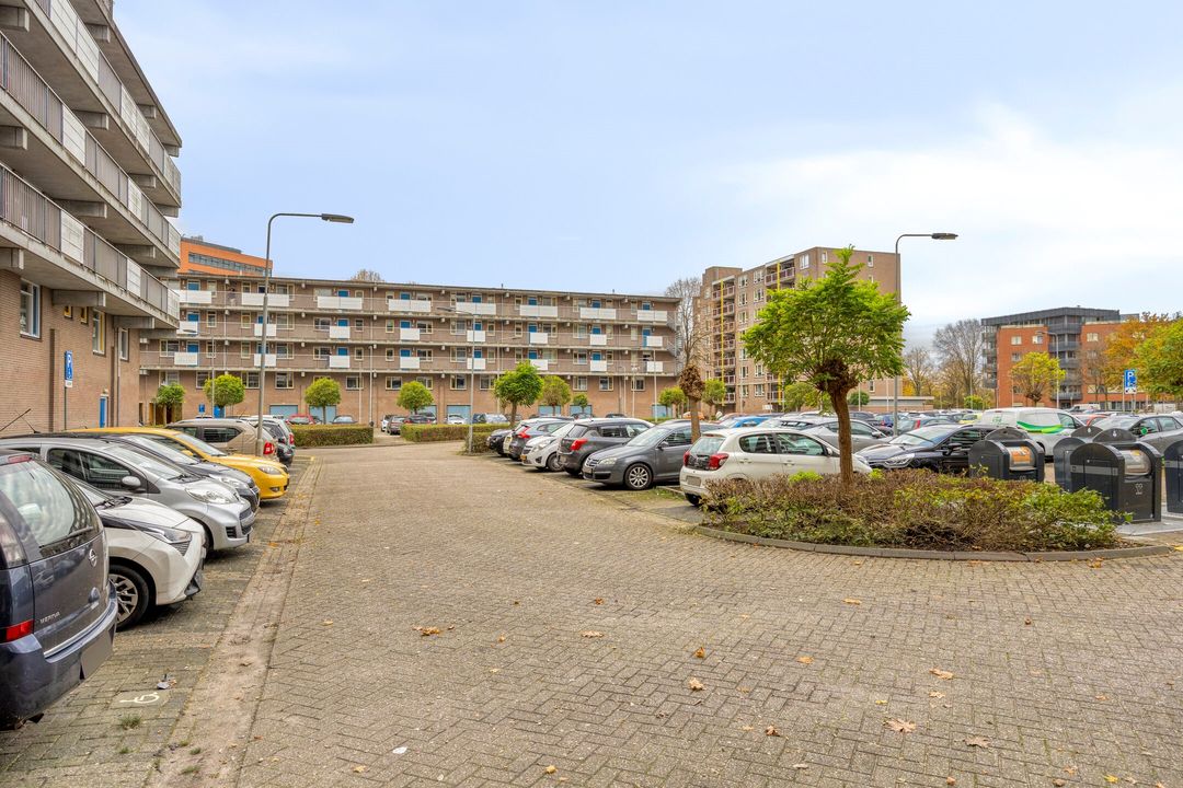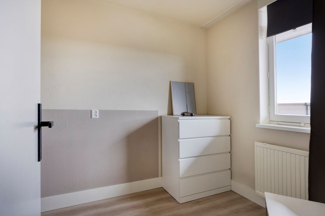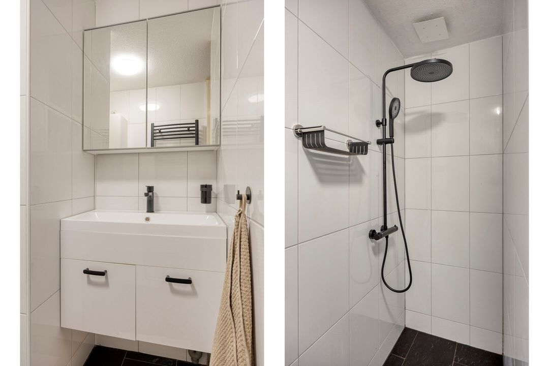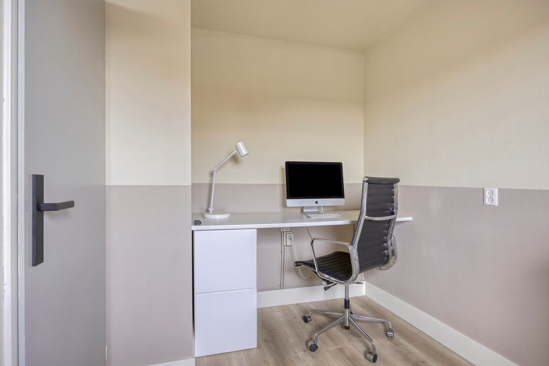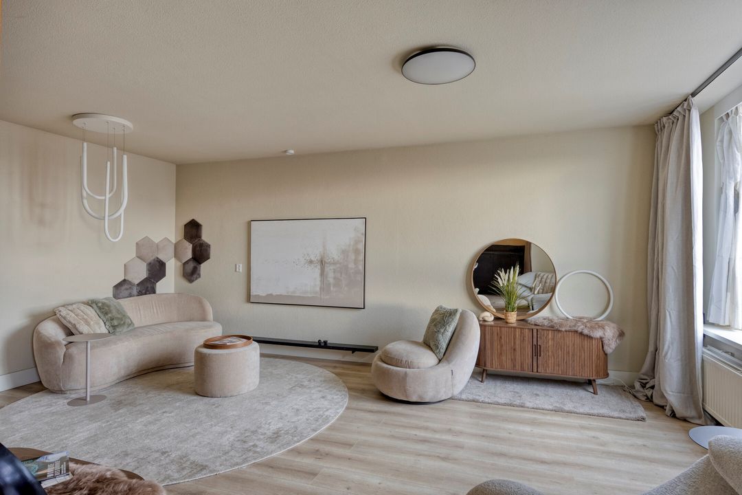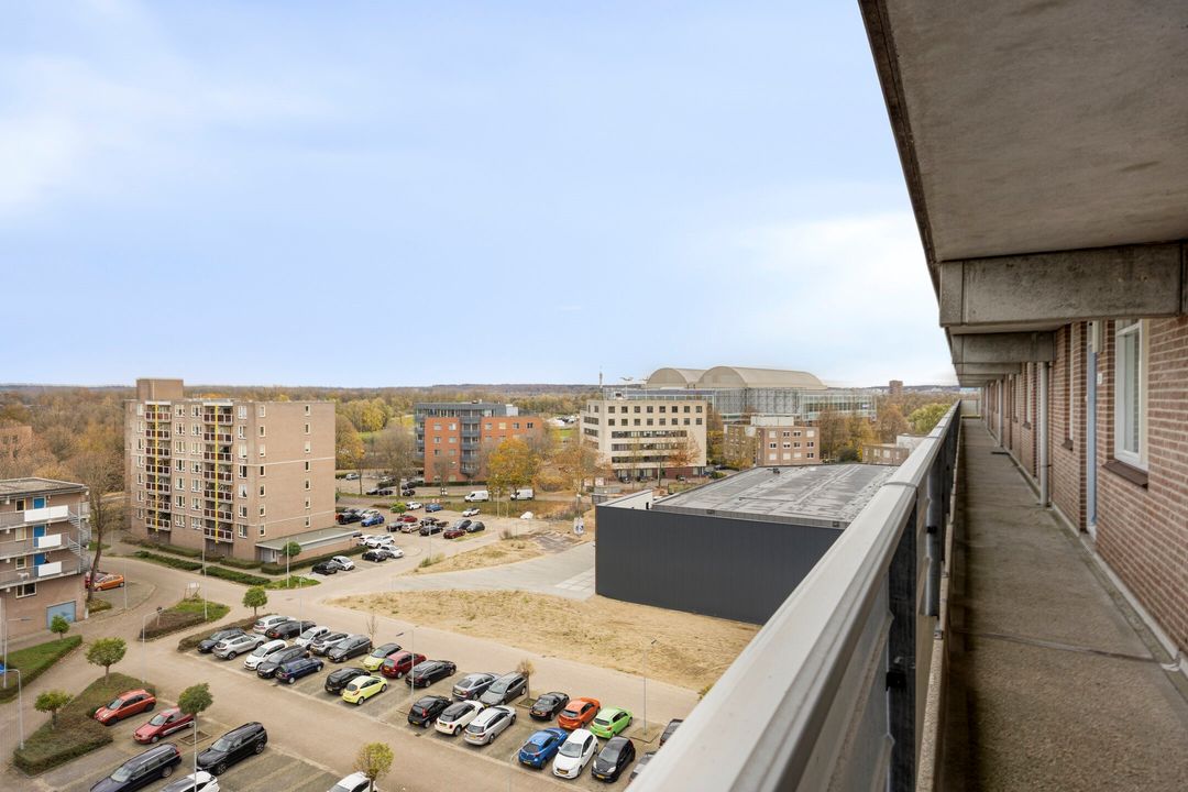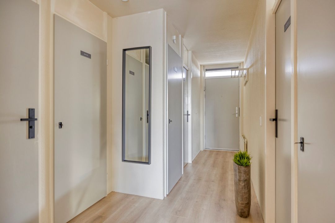 Appartement (8e verdieping): entree, hal, toegang tot een provisiekast, een meterkast (schakelkast met automaten) en cv-/wasruimte, het moderne toilet met fontein, ruime (ouder)slaapkamer met inloopkast en een 2de slaapkamer welke momenteel in gebruik is als werkkamer. Een moderne tot plafondhoogte betegelde badkamer met inloopdouche, handdoekradiator en badkamermeubel. Ruime woonkamer met doorloop naar de halfopen keuken in parallel-opstelling, voorzien van HPL werkbladen en inbouwapparatuur (o.a. koelkast, vaatwasser, geïntegreerde rvs afzuigkap, inductie kookplaat, combi-oven). Grenzend aan de keuken vindt u de toegang tot het balkon, welke volledig is afgewerkt met hardhouten vlonderdelen.